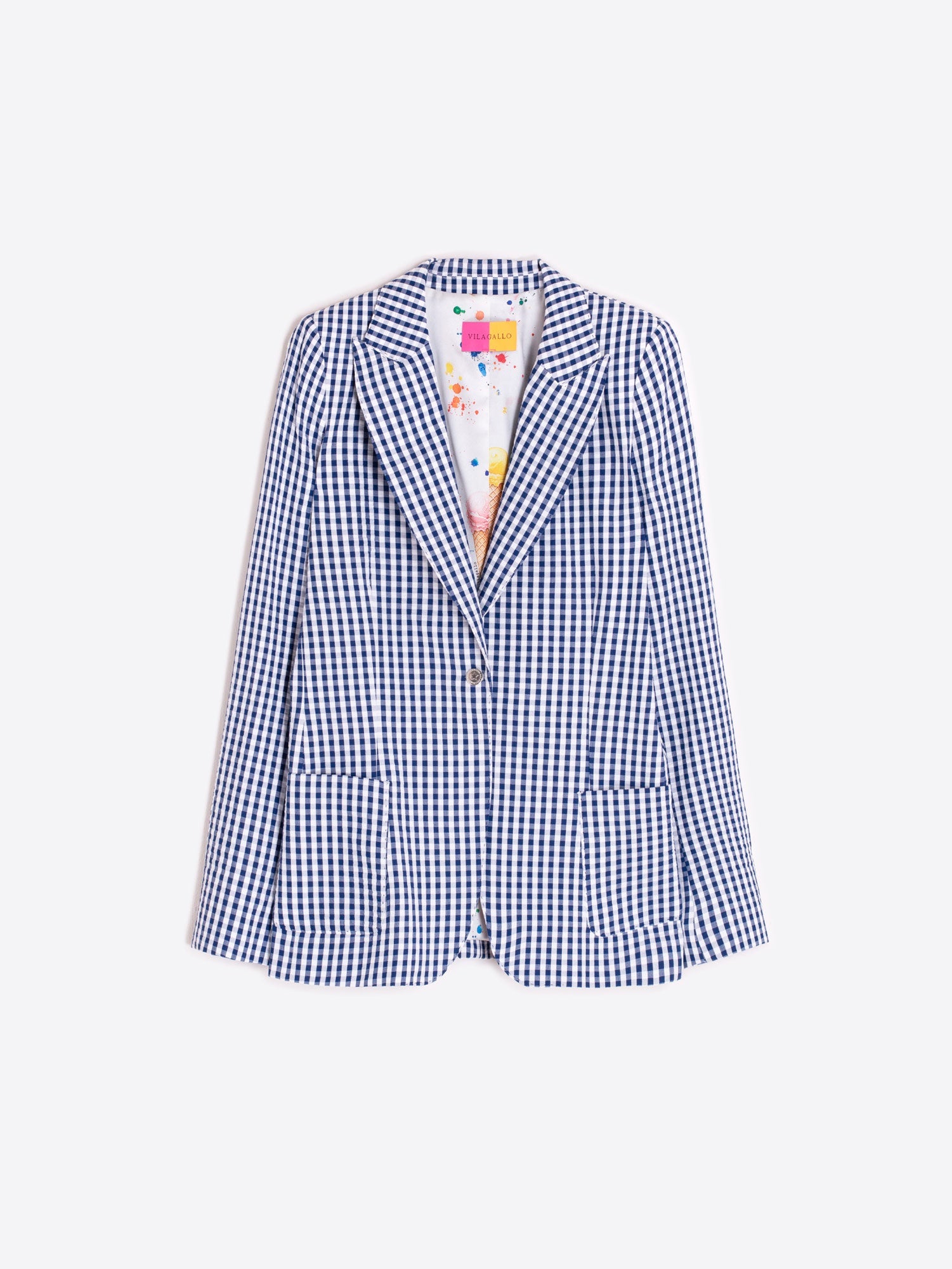 This delightful Vilagallo seersucker jacket brings instant charm with its timeless blue and white check pattern. Made from lightweight cotton, it's designed for comfort with a relaxed regular fit, smart notched lapels, and handy patch pockets. Button up and throw it over a dress or mix-and-match with your favourite separates. The surprise? A fun patterned lining that peeks out with every wear. Playful, practical, and endlessly stylish.
