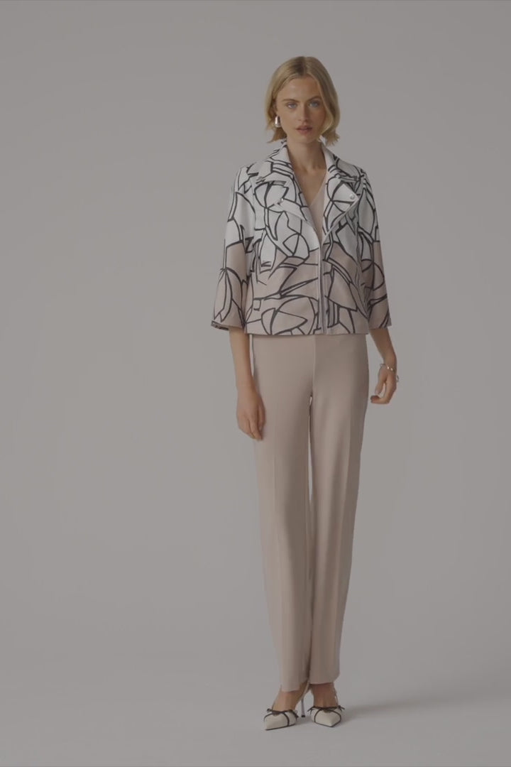 Elevate your everyday style with this stunning faux suede swing jacket from Joseph Ribkoff. Featuring an eye-catching abstract print in soft ivory and beige tones, it's designed to transform your casual jeans-and-top look into something effortlessly chic. The notched collar and three-quarter sleeves create a flattering silhouette, while decorative snaps and a distinctive zipper tape along the front add personality and visual interest. Practical functional pockets keep your essentials close. Versatile and sophisticated, this jacket is your go-to piece for adding polish to any outfit.