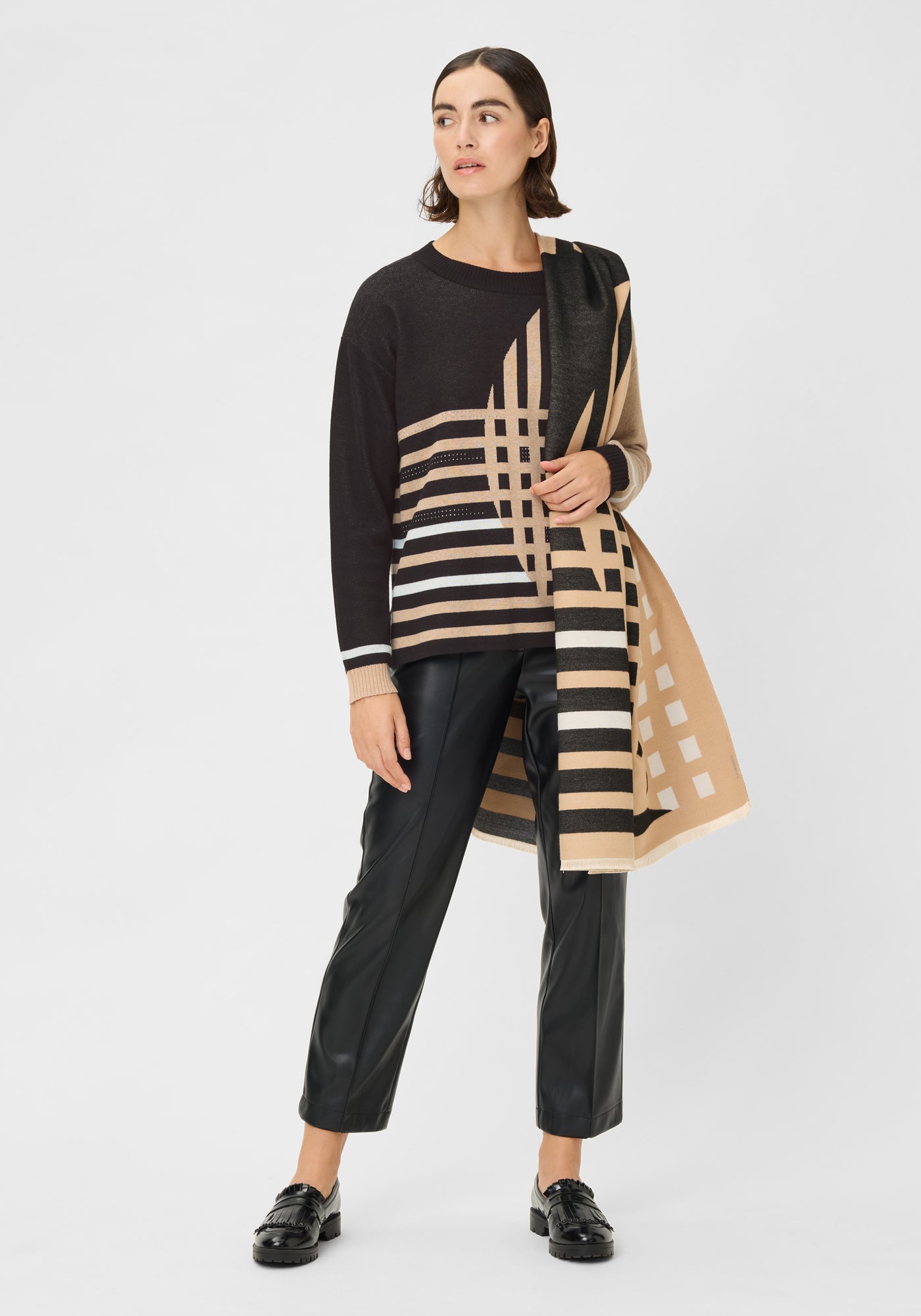 This fine-knit "Cora" jumper features a decorative panel print inspired by the stylish 1960s retro look. Its wide fit and dropped shoulders create a relaxed, modern silhouette, while the round neck adds classic appeal. Made from a soft cotton blend, it offers all-day comfort. Easily pair it with smart trousers or with joggers for a laid-back vibe, making it a versatile addition to your wardrobe.