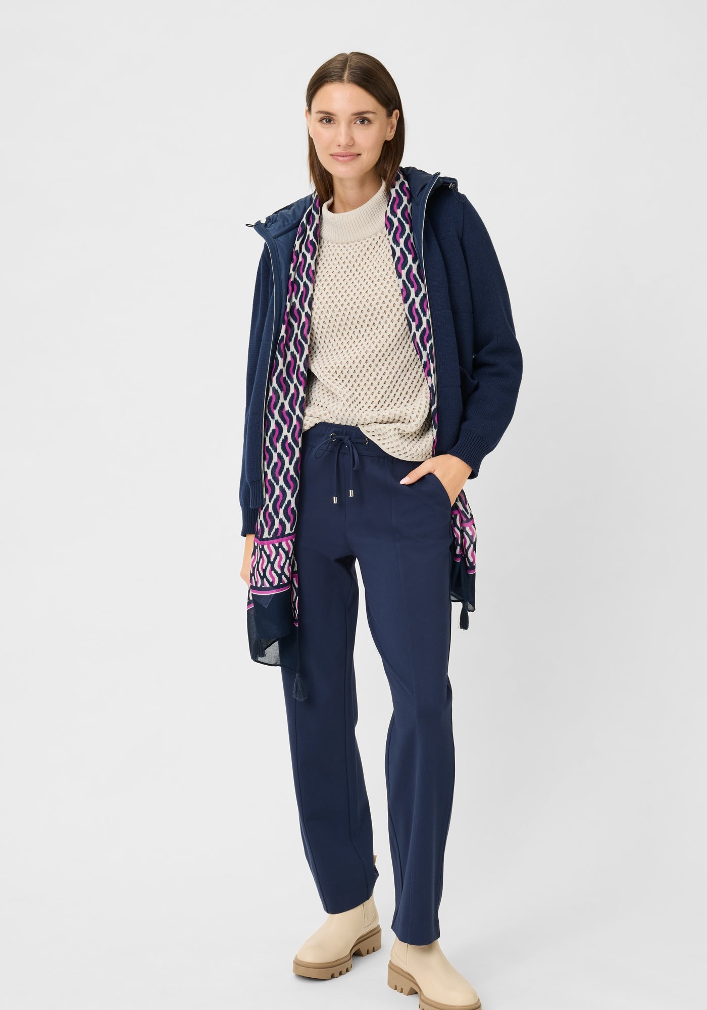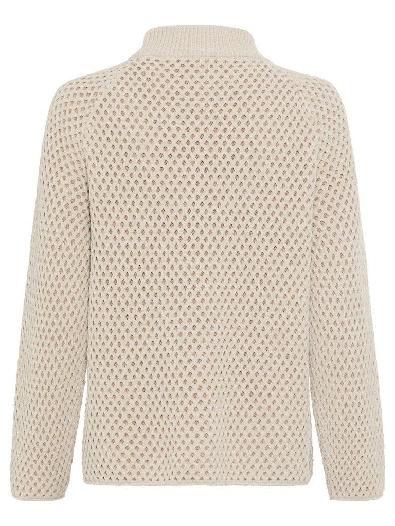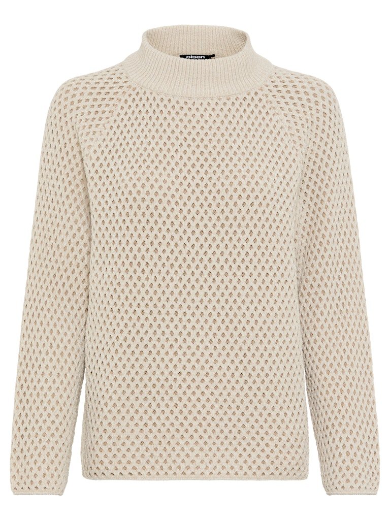 This Olsen 'Henny' jumper in beige combines fashionable comfort with practical warmth. Its all-over pattern and modern silhouette, enhanced by casual raglan sleeves and a ribbed knit stand-up neckline, make it an effortless style choice. Made from a soft fabric blend, it offers both cosiness and durability. Perfect for pairing with tailored trousers for a smart look or joggers for a relaxed, comfortable outfit.
