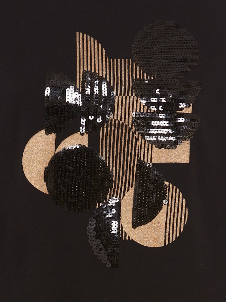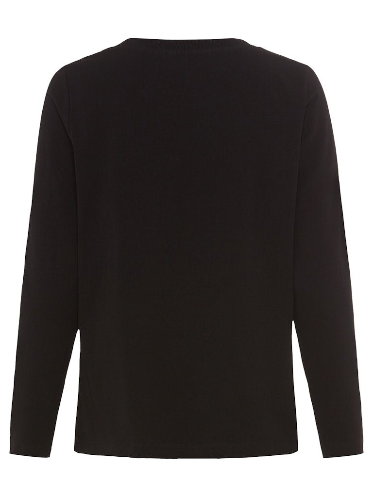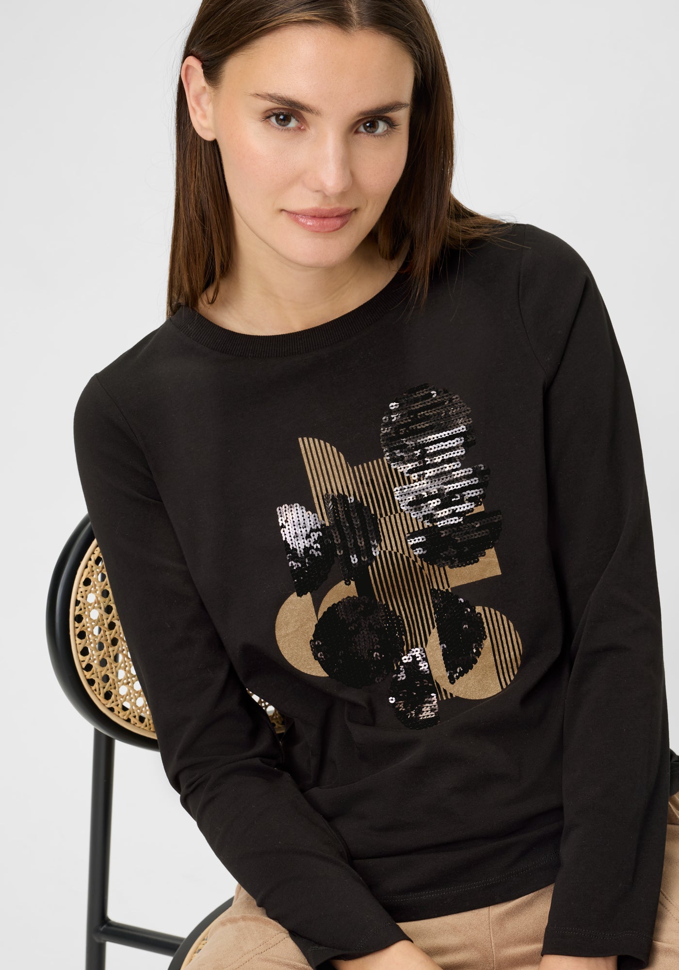 This Olsen t-shirt in black features a flattering "Hannah" fit with a straight silhouette, perfect for everyday wear. Made from a soft cotton blend with stretch, it offers comfort and ease of movement. The long sleeves and round neck add a classic touch, while subtle sequin embellishments bring a hint of sparkle. Style it effortlessly with black or camel jeans and an elegant cardigan for a polished, comfortable look.