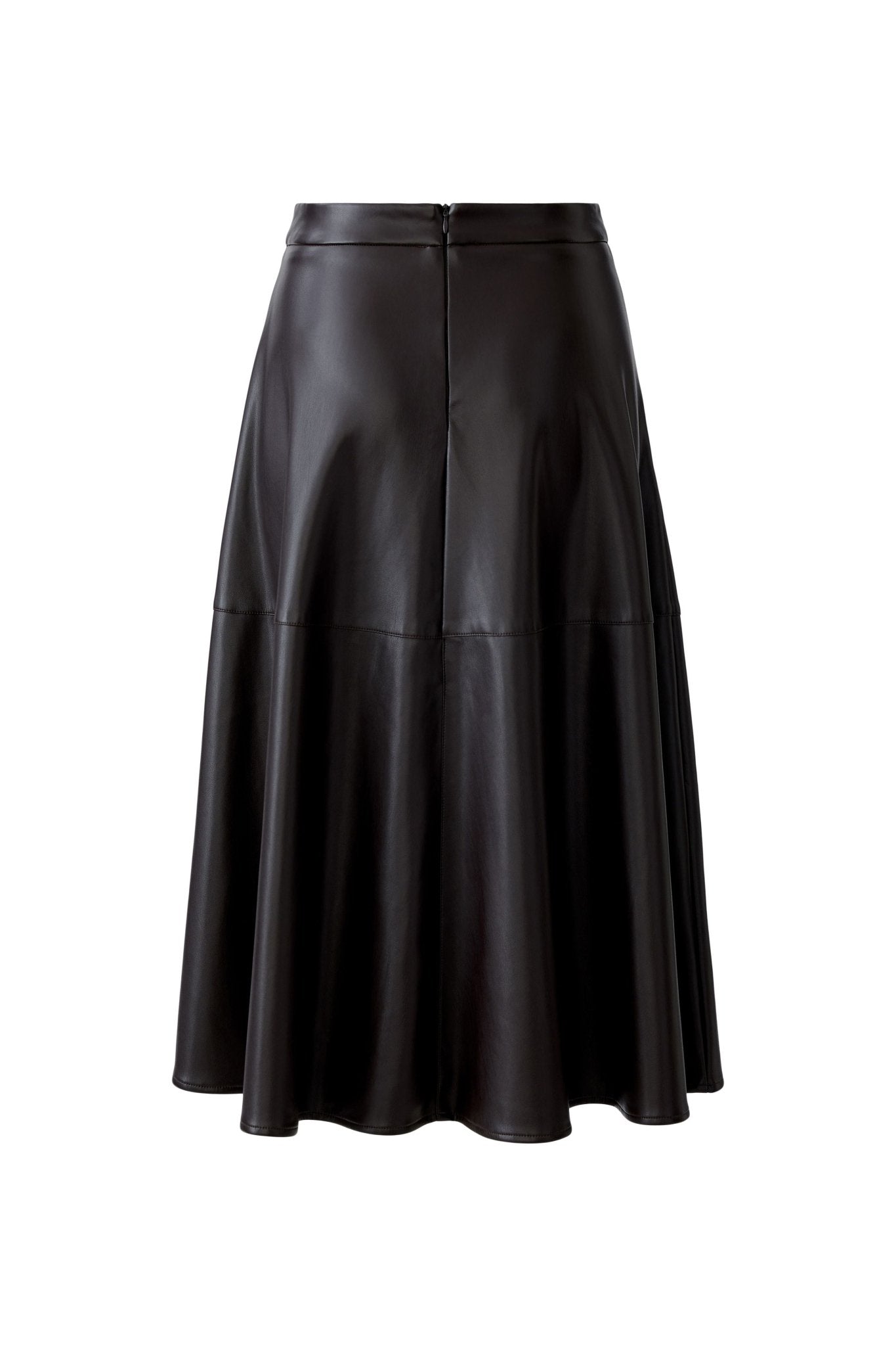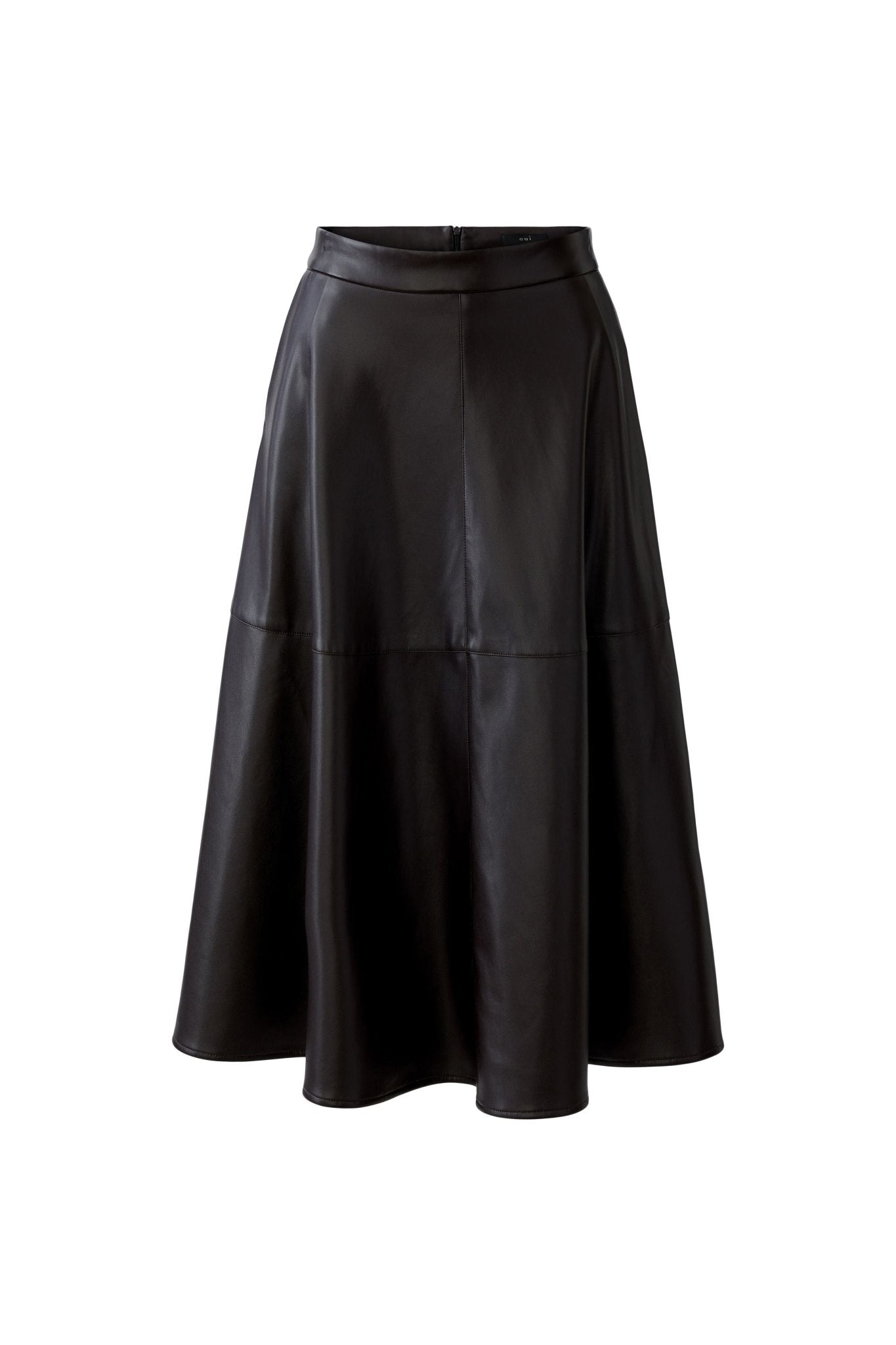 This dark brown Oui skirt combines a sleek leather look with a soft, brushed interior for ultimate comfort. Its flattering midi length and swinging A-shape cut offer elegant movement, while the waistband and discreet back zipper ensure a secure fit. Practical side pockets and authentic-style decorative stitching add thoughtful details, making it a stylish and comfortable choice perfect for pairing with knitwear or a flowing blouse.