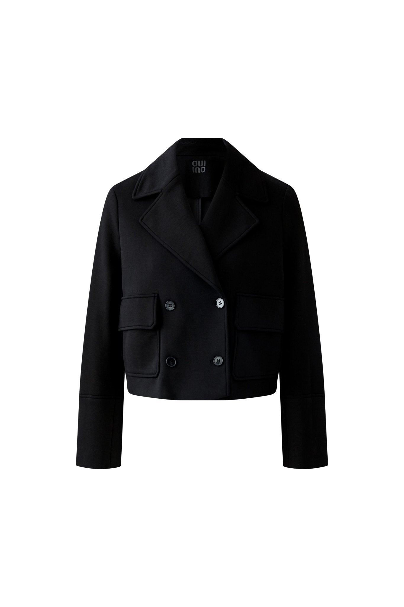 This modern double-breasted jacket pairs a sleek, cropped boxy cut with a soft scuba fabric that feels comfortable and stylish. Featuring a classic collar, horn-look buttons, and stylish patch pockets with flaps, it balances timeless design with everyday functionality. The long sleeves are finished with wide cuffs, and the versatile black colour makes it easy to integrate into your wardrobe for a range of occasions. Perfect for adding a contemporary edge to your outfits with lasting comfort.