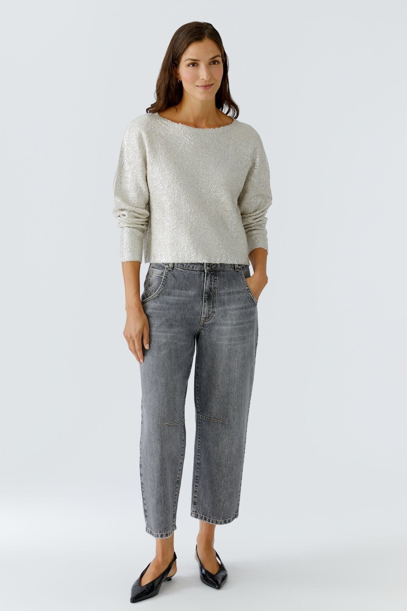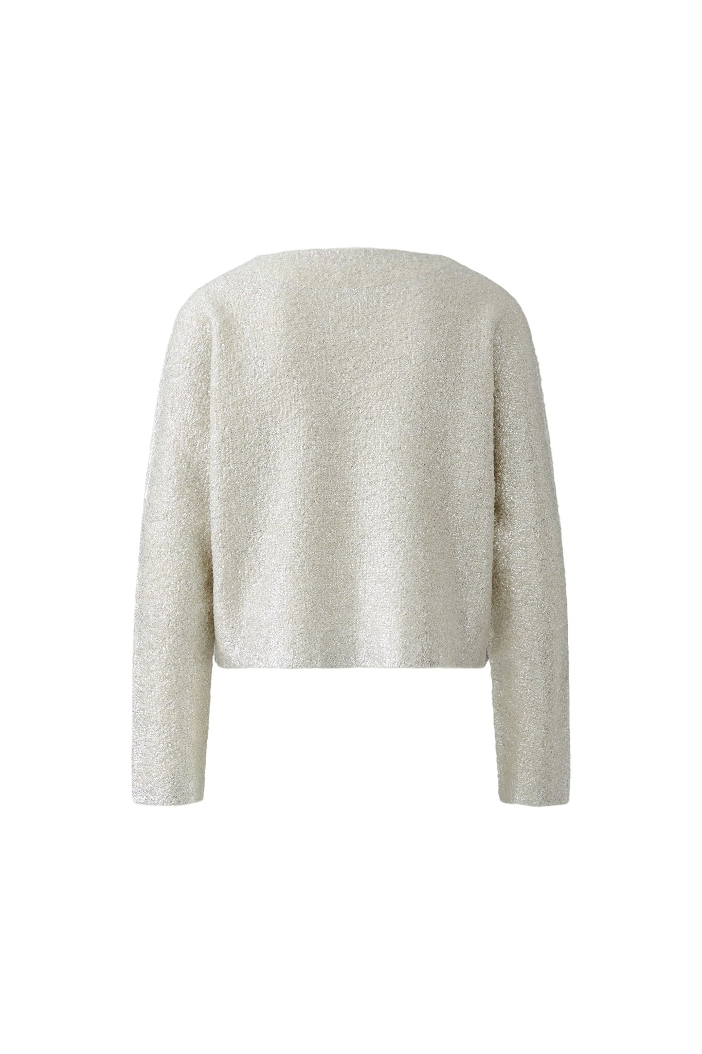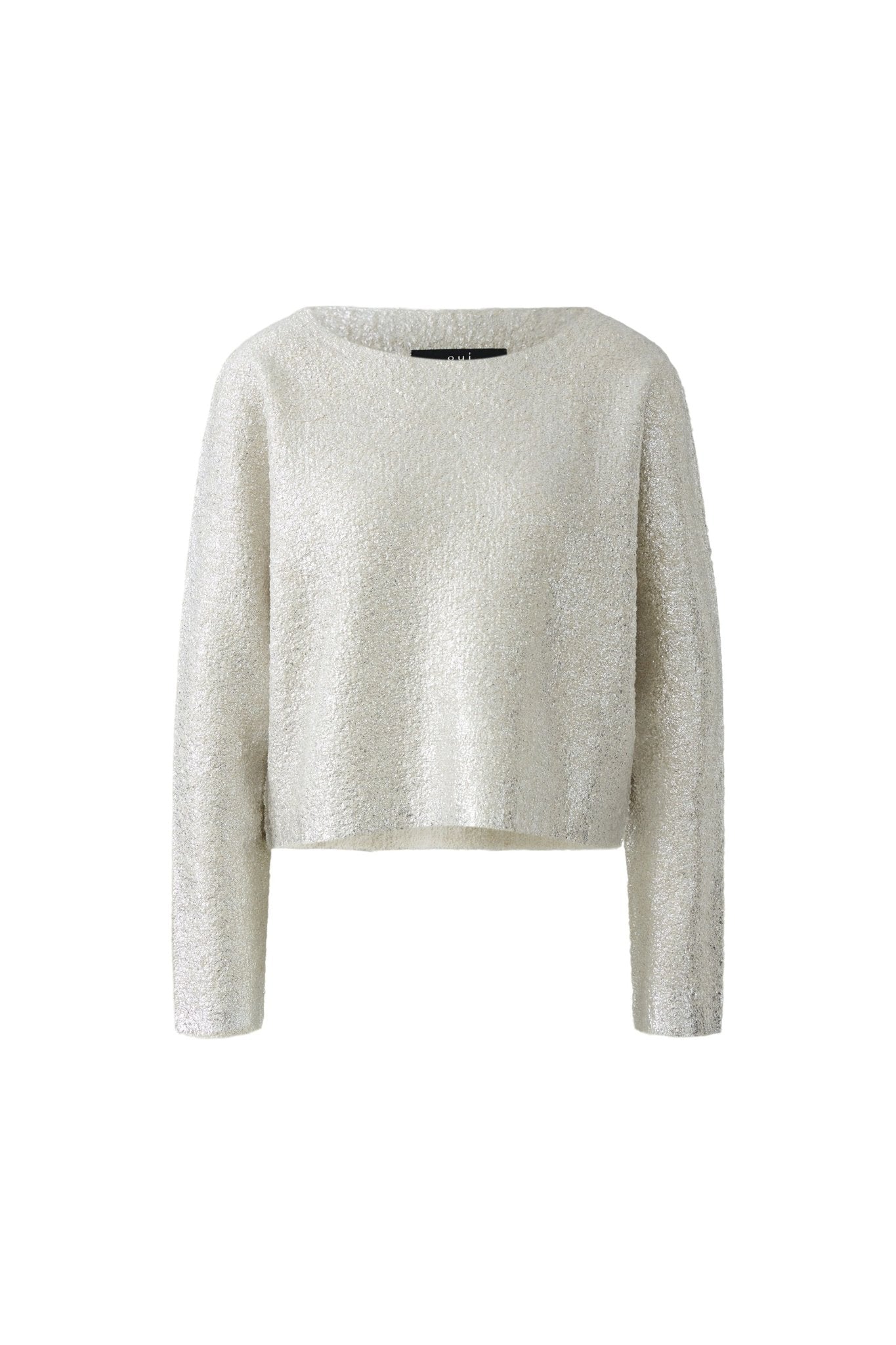 This Oui jumper features a seamless knit construction in a soft wool blend for cosy comfort. The pullover is elegantly printed with a subtle silver gloss, adding a refined touch to its casual, shortened cut. Long sleeves and a flattering boat neckline enhance its unique design. Versatile and stylish, it effortlessly transitions from day to night with just a simple swap of jewellery and accessories, making it a dependable addition to your wardrobe.