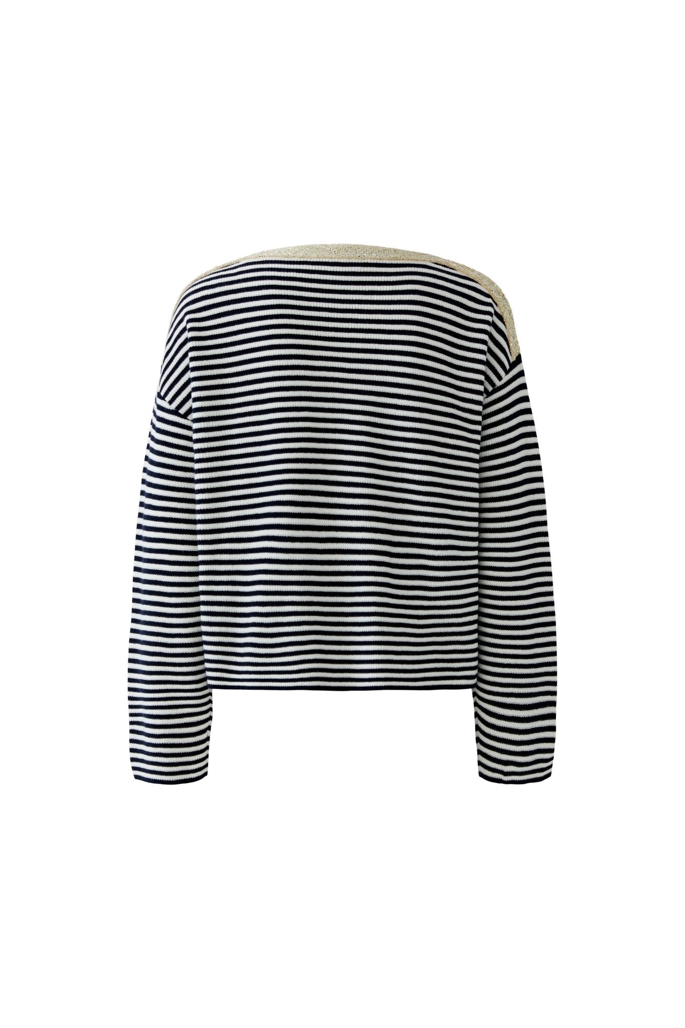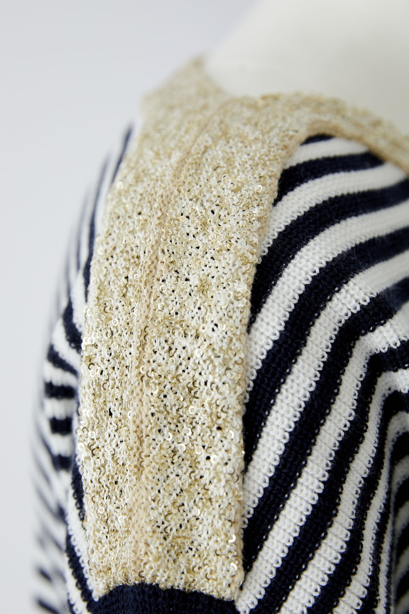 Add sparkle to your casual wardrobe with this eye-catching striped sequin jumper. Crafted from soft pure cotton with a sporty stripe design, it features shimmering micro sequins at the neckline and shoulder seam for a touch of glamour. The relaxed, shortened silhouette with dropped shoulders and boat neck creates an effortlessly chic look, while elastane reinforced cuffs and hem ensure lasting wear. Style with white cropped jeans and trainers for everyday chic.
