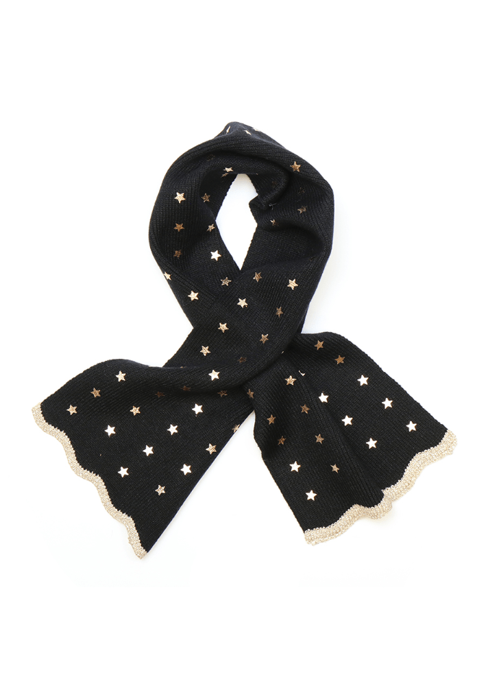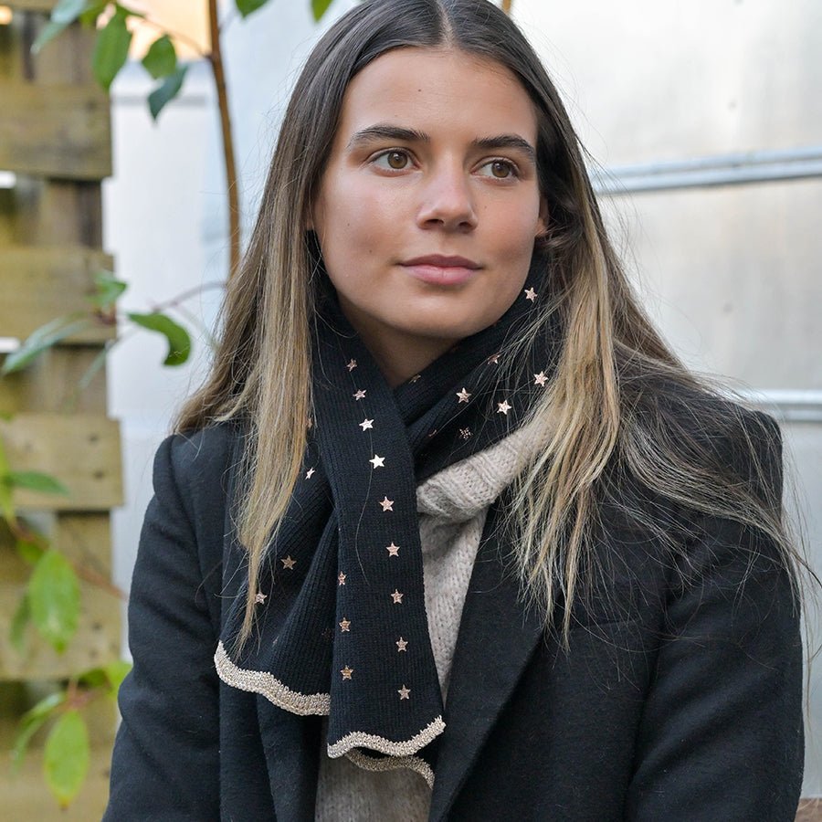 Elevate your winter style with this stunning pull-through scarf, crafted from a luxurious recycled blend that's kind to the planet. The metallic star print adds a touch of celestial glamour, while the shimmering lurex scalloped edge catches the light beautifully. Versatile and effortlessly chic, this piece transforms any outfit into something special—whether you're layering over a coat or draping it casually for an instant polish. A wardrobe essential that feels as good as it looks.