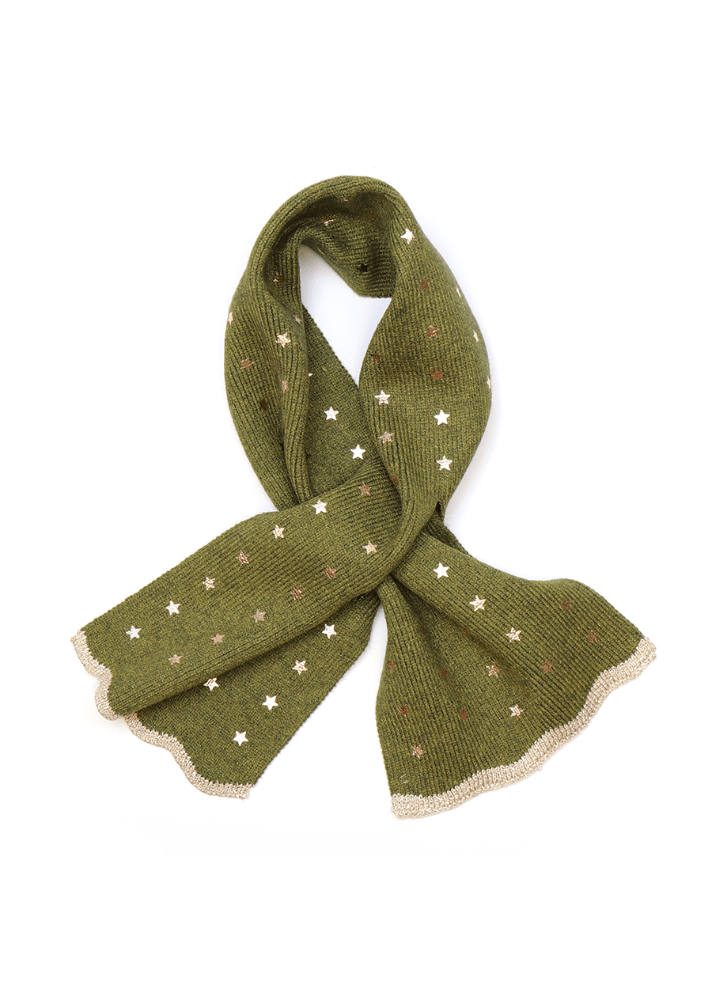 Elevate your everyday look with this versatile pull-through scarf in soft khaki green. Crafted from a sustainable recycled blend, it features a shimmering metallic star print that catches the light beautifully, paired with a delicate lurex scalloped edge for added refinement. The perfect accessory to effortlessly bring sophistication to any outfit, whether you're smart or keeping it casual.