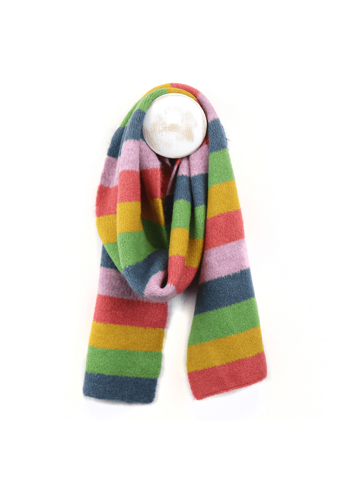 Brighten up your winter wardrobe with this cheerful knitted colour block stripe scarf in vibrant rainbow hues. Crafted from soft, classic knit fabric, it features bold stripes that bring joy to any outfit. Perfect on its own or paired with the matching hat to create a coordinated, feel-good accessory set that celebrates colour and warmth through the colder months.