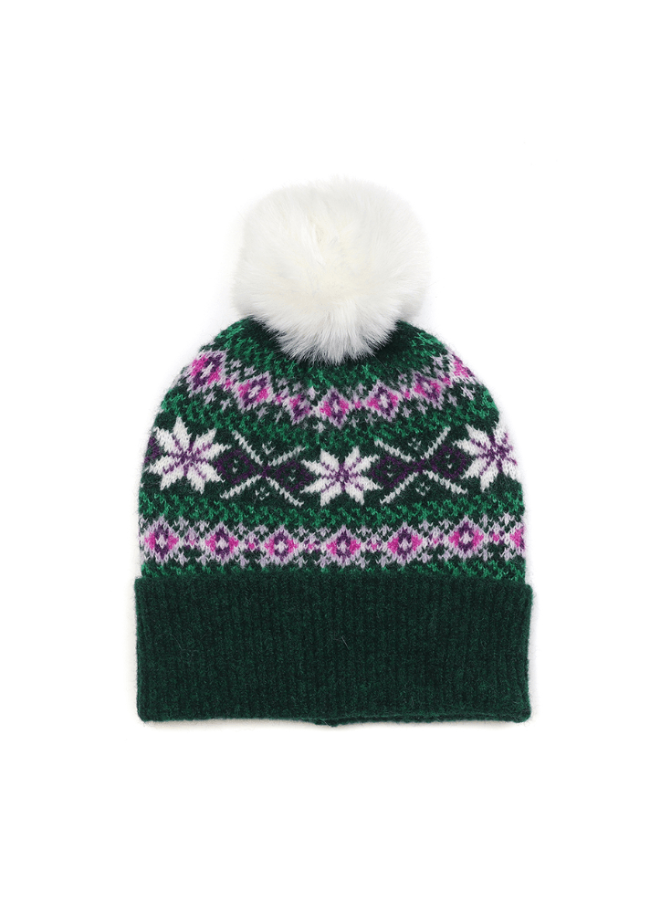 Embrace cosy Scandi charm with this delightful starflower knit bobble hat in dark green, pink, and white. Topped with a plush faux fur pom-pom for extra warmth and style, it's the perfect winter essential. Love the look? Complete your set with the matching scarf and gloves for a coordinated, effortlessly Nordic aesthetic that keeps you snug through the season.