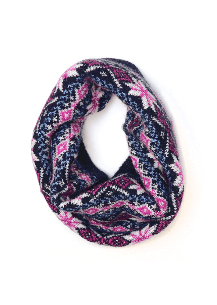 Discover the perfect winter essential with this beautifully crafted Scandi starflower snood in navy blue, pink, and white. Its Nordic-inspired design brings pattern to your seasonal style. Create a coordinated, cosy look by pairing it with our matching hat and gloves—available separately to help you build the complete set. Soft, warm, and wonderfully versatile, this snood is your go-to accessory for staying stylish through the colder months.