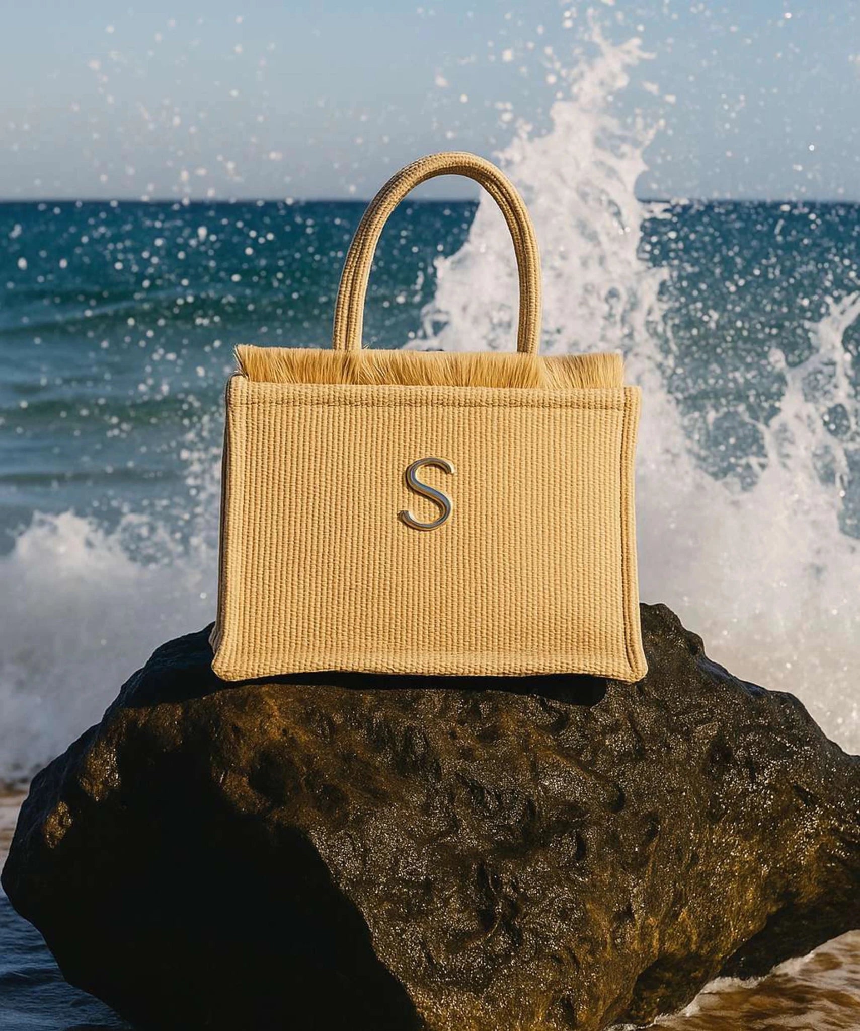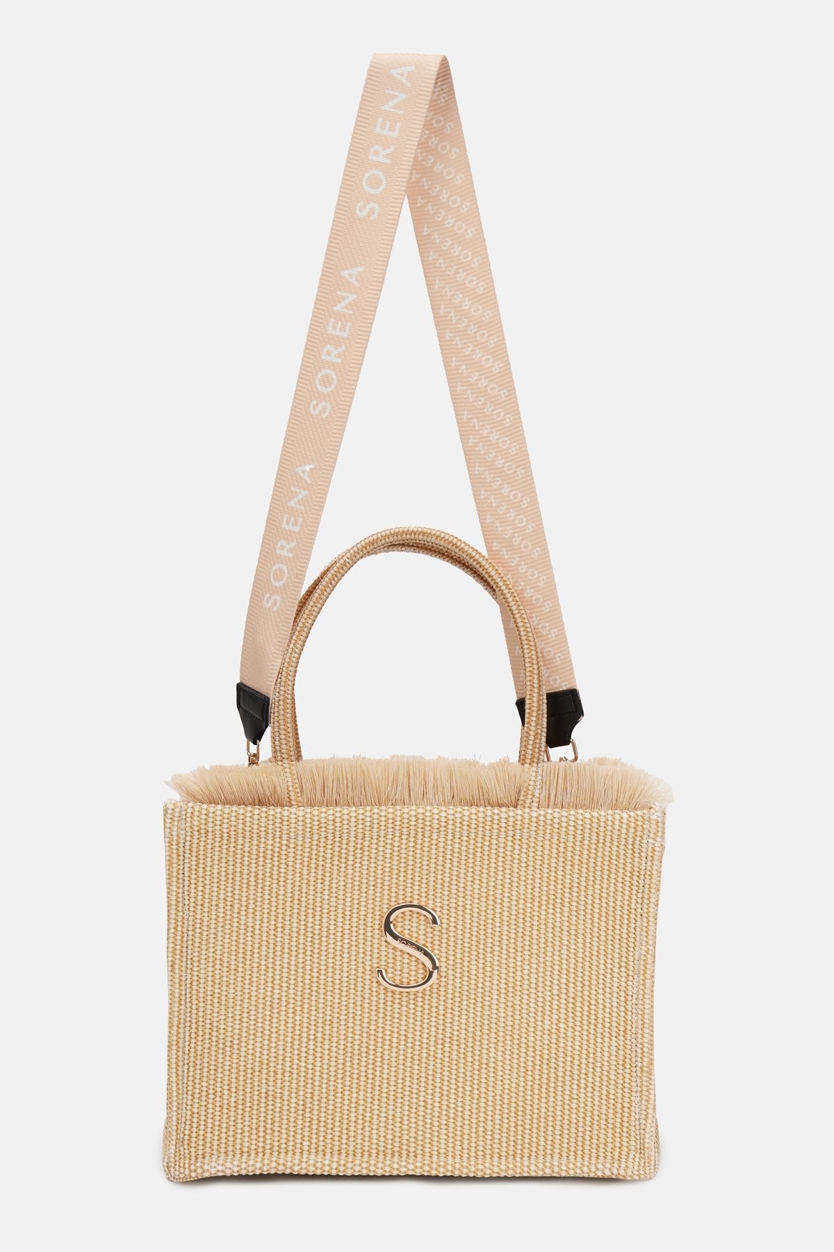Discover effortless elegance with the Sorena medium tote bag "Irida", handcrafted in Greece. This natural beige woven design features charming fringe detailing and a striking signature red lining that adds a pop of colour when you open it. The gold 'S' logo marks authentic Sorena craftsmanship, while the detachable cream webbed shoulder strap offers flexible carrying options. A practical zipped interior pocket keeps your essentials secure. Perfect for everyday adventures or weekend getaways, this versatile tote combines Mediterranean style with functional design that works with any wardrobe.
