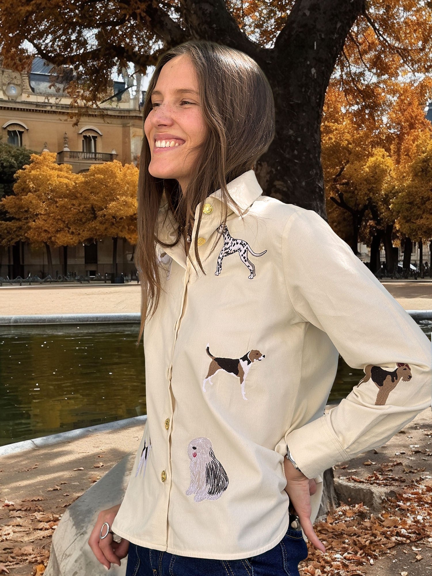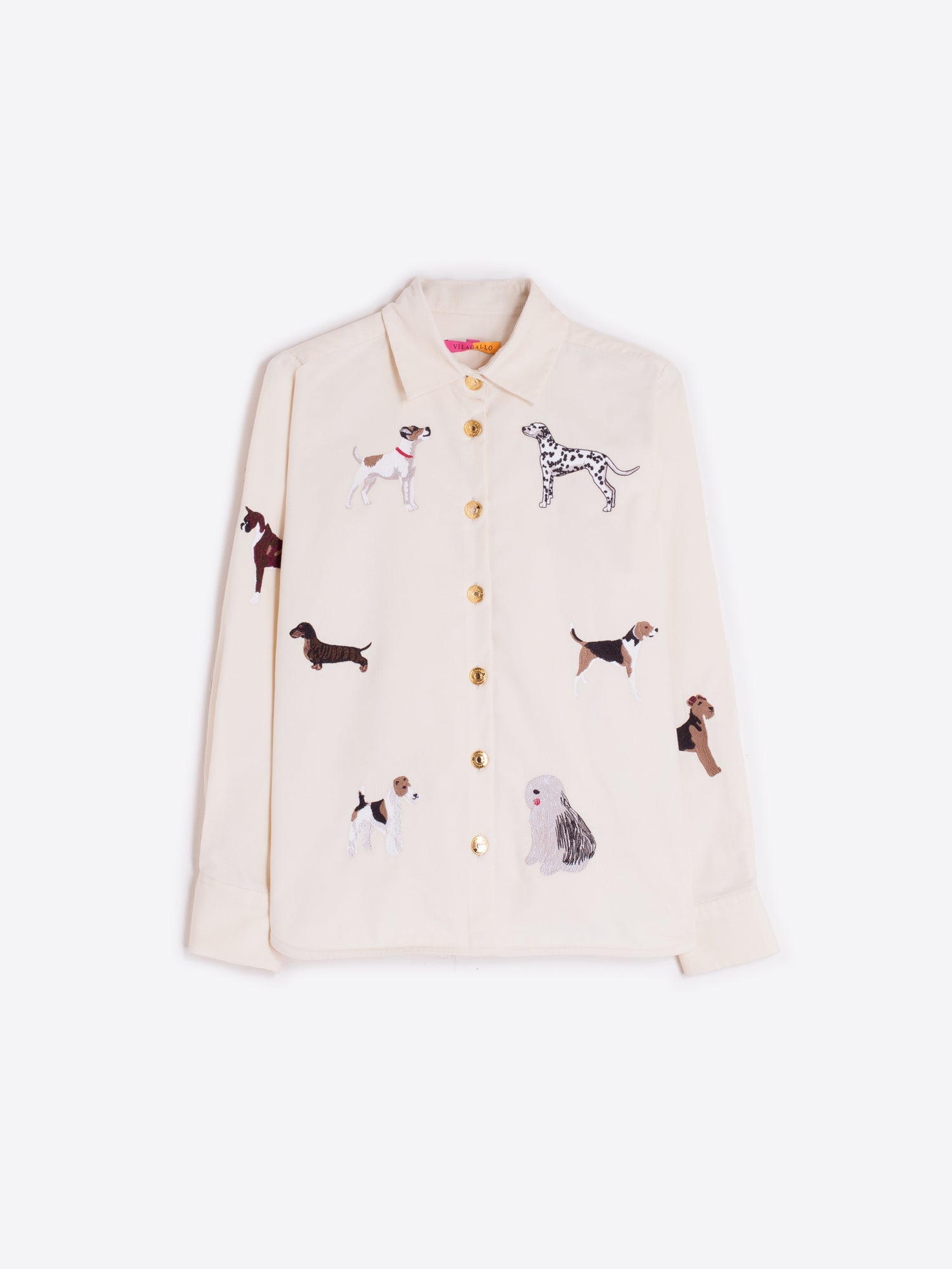 This ecru corduroy shirt combines sophistication and playful detail with embroidered dog motifs featuring various breeds across the front. Tailored with a straight cut, classic collar, and gold buttons, it exudes refinement! Wide cuffs and a straight hem complete the look, crafted from soft, warm fabric perfect for autumn and winter. Pair it effortlessly with jeans and an overcoat or blazer for a stylish look this season.